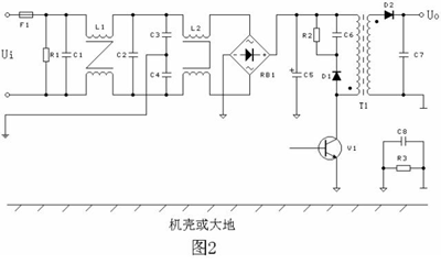 图1是一个普遍应用的反激式(或称为回扫式)开关电源工作原理图,50Hz或60Hz交流电网电压首先经整流堆整流,并向储能滤波电容器C5充电,然后向变压器T1与开关管V1组成的负载回路供电。图2是进行过电磁兼容设计后的电原理图。